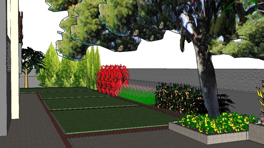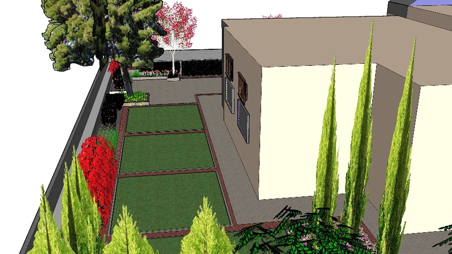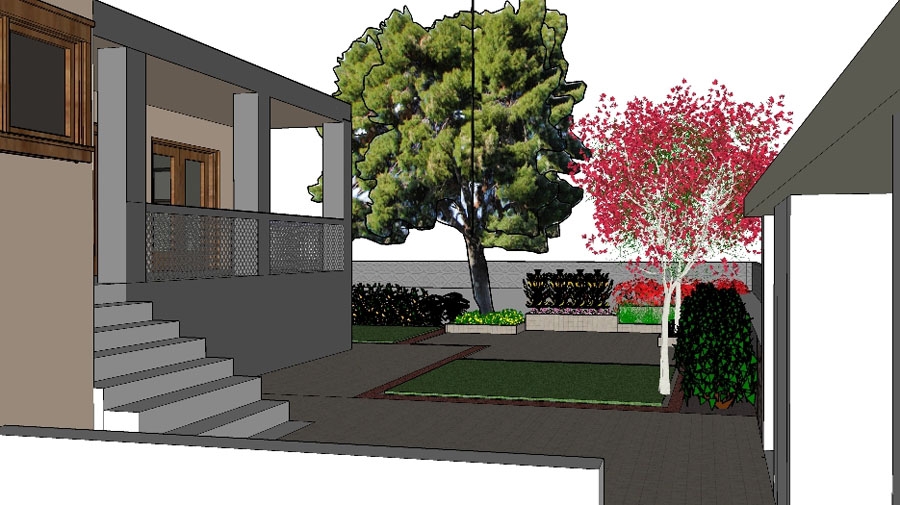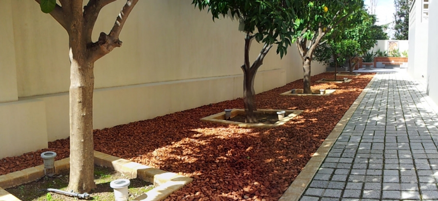 Κάλυψη της επιφάνειας με κεραμικό βότσαλο σε συνδυασμό με μια σειρά απο Οπωροφόρα δέντρα.